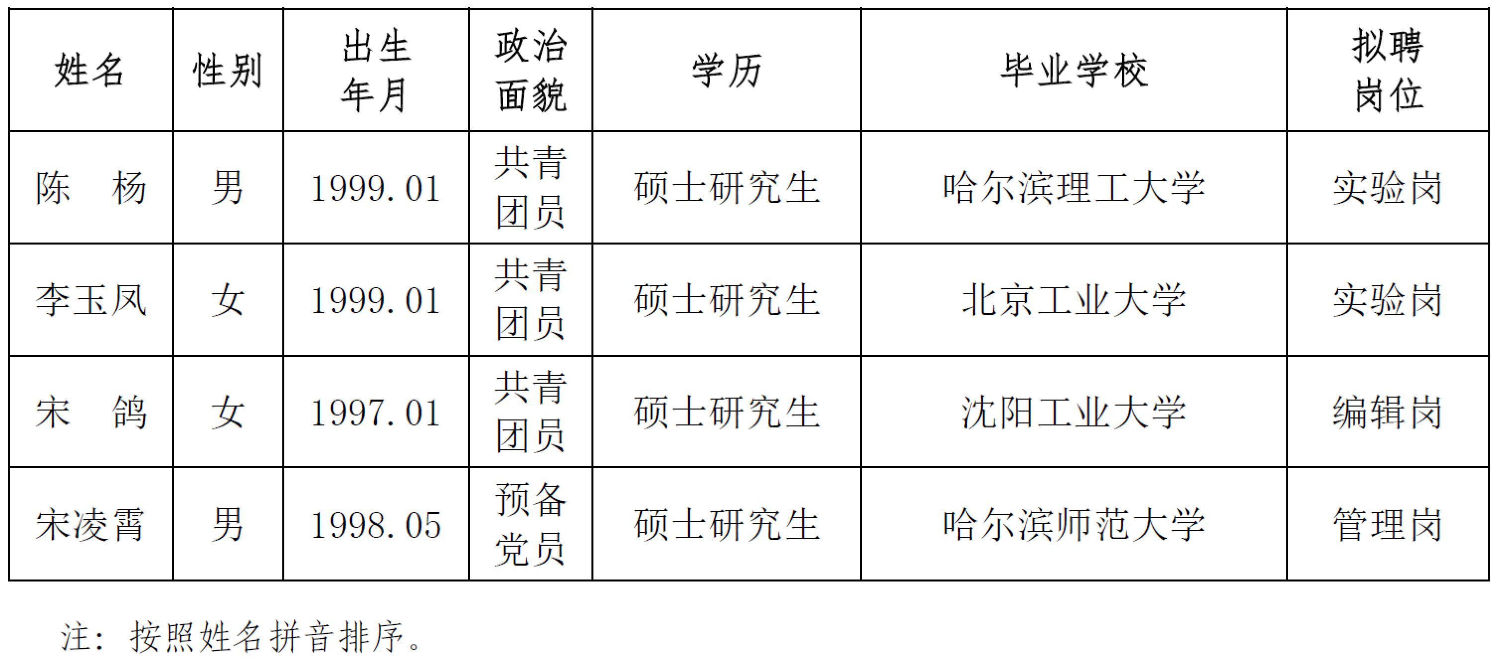 發(fā)布時間: 2024-05-14 點擊數(shù)量:13966根據(jù)中國地震局《關(guān)于貫徹執(zhí)行〈事業(yè)單位公開招聘人員暫行規(guī)定〉的通知》文件精神和我所用人計劃,經(jīng)公開發(fā)布招聘信息、資格審查、面試等程序確定擬錄人員。現(xiàn)將擬錄人員相關(guān)情況公示如下,公示期7個工作日,期間如有異議請與中國地震局工程力學(xué)研究所人才資源部或紀(jì)檢室聯(lián)系,以個人名義反映情況的領(lǐng)署真實姓名,以單位名義反映情況的須加蓋公章。