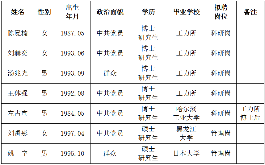 發布時間: 2022-05-30 點擊數量:12208根據中國地震局《關于貫徹執行〈事業單位公開招聘人員暫行規定〉的通知》文件精神和我所用人計劃,經公開發布招聘信息、資格審查、面試等程序確定擬錄人員。現將擬錄人員相關情況公示如下,公示期7天,期間如有異議請與中國地震局工程力學研究所人才資源部或紀檢室聯系,以個人名義反映情況的須署真實姓名,以單位名義反映情況的須加蓋公章。